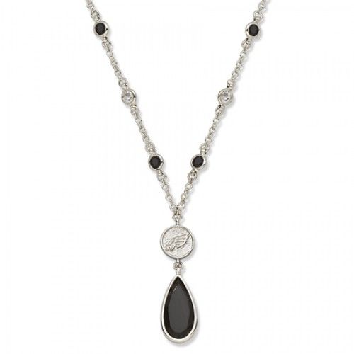This Philadelphia Eagles Necklace Showcases Your Favorite Nfl TeamS Colors and Logo in the Form of a Glamorous Crystal Necklace. a Pear Shaped Black Crystal Dangles From the Chain Necklace Under the Official Eagles Logo. the Chain Is Accented with 0.25 White Crystals That Come in a Complimentary Round Shape. Cheer For Your Favorite Nfl Team in Style Whenever You Wear This Philadelphia Eagles Necklace with Black and White Crystals. Processing Time: 4 days. BRAND : NFL Officially Licensed CHAIN TYPE : LINK CLASP TYPE : SPRING RING GEM TYPE : QUARTZ GEM TYPE - 2 : QUARTZ METAL STAMP : 7.2 METAL TYPE : RHODIUM PLATED BASE METAL METAL UNIT OF MEASURE : GRAMS SIZE : 18 STONE CLARITY : I1 STONE CLARITY - 2 : I1 STONE COLOR : BLACK STONE COLOR - 2 : WHITE STONE COLOR - 3 : BLACK STONE CUT : VERY GOOD CUT STONE CUT - 2 : VERY GOOD CUT STONE SHAPE : PEAR SHAPE STONE SHAPE - 2 : ROUND SHAPE STONE WEIGHT : 0.75 STONE WEIGHT - 2 : 0.25 TOTAL GEM WEIGHT : 1.00 TOTAL METAL WEIGHT : NO METAL STAMP UNIT OF MEASURE (DIMENSIONS) : IN