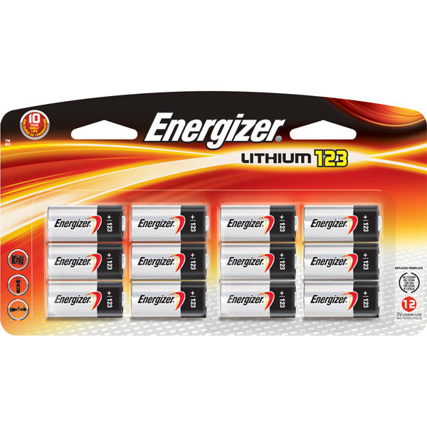ENERGIZER 123 LITHIUM BATTERY12-PACK Replacement fo 5018LC, CR123, CR123A, CR17345, EL123 3 VoltsExceptional power and life for high-tech flashlights, flash units, rifle scopes and night vision gogglesPerform in extreme temperatures from -40F to 140FHolds power for 10 years when not in useLeak-resistant construction BRAND : ENERGIZER