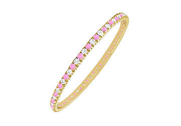 A fashionable circle eternity bangle surrounded with alternate sparkling brilliant-cut round diamonds pink sapphires are beautifully 4-prong-set. Made in 14K yellow gold has a total gem weight (TGW) of 3.00 carat. This gorgeous eternity bangle is made in USA and we can make this bangle exactly as per your wrist. Call us for free bangle sizer.