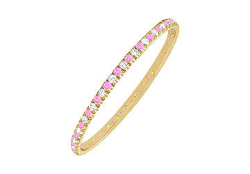 A fashionable circle eternity bangle surrounded with alternate sparkling brilliant-cut round diamonds pink sapphires are beautifully 4-prong-set. Made in 14K yellow gold has a total gem weight (TGW) of 5.00 carat. This gorgeous eternity bangle is made in USA and we can make this bangle exactly as per your wrist. Call us for free bangle sizer.