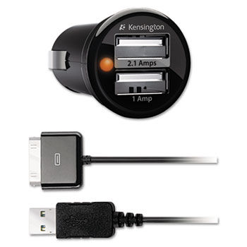 Warranty Manufacturer's limited two-year warranty. ADAPTER/CHARGER TYPE : CAR CHARGER BRAND : KENSINGTON CABLE TYPE : DETACHABLE 30-PIN TO USB COLORS : BLACK COLORS : BLACK CONNECTOR/PORT/INTERFACE : USB CONNECTOR/PORT/INTERFACE : USB TO 30-PIN FOR DEVICE TYPE : 30-PIN MOBILE DEVICES FOR USE WITH : 30-PIN MOBILE DEVICES GLOBAL PRODUCT TYPE : ADAPTERS/CHARGERS-PLUG ADAPTER/USB CHARGER GREEN INDEX : N OEM/COMPATIBLE : COMPATIBLE PORTS/AMPS : ONE 2.1 AMP PORT; ONE 1.0 AMP PORT POST-CONSUMER RECYCLED CONTENT PERCENT : 0 % POST-CONSUMER RECYCLED CONTENT PERCENT : 0 % POWER SOURCE(S) : 12 VOLT VEHICLE OUTLET PRE-CONSUMER RECYCLED CONTENT PERCENT : 0 % PRE-CONSUMER RECYCLED CONTENT PERCENT : 0 % RECYCLABLE : N TOTAL RECYCLED CONTENT PERCENT : 0% UNIT OF MEASURE : EA