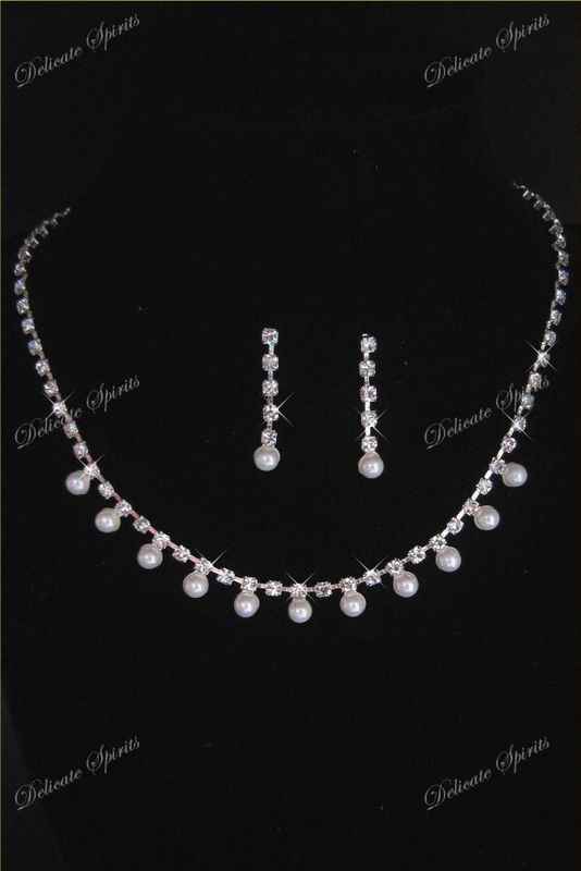 Prima Donna Rhinestone Diamond Off White Pearl Prom Wedding Necklace Earring Set