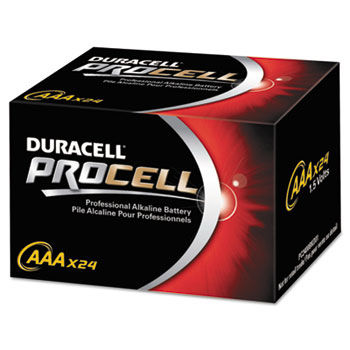 BATTERY SIZE : AAA BATTERY TYPE : ALKALINE BRAND : DURACELL FOR USE WITH : PROFESSIONAL AND INDUSTRIAL ELECTRONIC DEVICES GLOBAL PRODUCT TYPE : BATTERIES-ALKALINE GREEN INDEX : N MATERIAL(S) : ALKALINE MANGANESE DIOXIDE POST-CONSUMER RECYCLED CONTENT PERCENT : 0 % POST-CONSUMER RECYCLED CONTENT PERCENT : 0 % PRE-CONSUMER RECYCLED CONTENT PERCENT : 0 % PRE-CONSUMER RECYCLED CONTENT PERCENT : 0 % QUANTITY : 24 PER BOX RECYCLABLE : N TOTAL RECYCLED CONTENT PERCENT : 0% UNIT OF MEASURE : BX VOLTAGE : 1.5 V