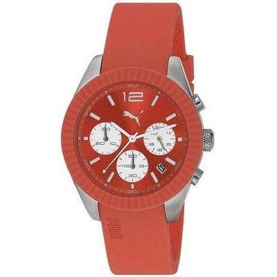 Known around the world as one of the premium athletic brands; Puma has now forged its way into the world of designer watches! The same reliability and attention to detail that you've come to expect from Puma athletic shoes and sportswear is now present in all Puma sports watches. We offer watches that can do as much; or as little; as you need. We offer chronograph models that measure pulse and other vitals or you can simply enjoy a lasting Puma watch that just tells time. No matter which Puma watch you choose; you are sure to love it for years to come. Red Polyurethane Band Adjustable Buckle Clasp Stainless Steel Case Analog Display Mineral Crystal Push/Pull Crown Red Dial White Numbers and Indicies White Luminous Hands with Silver Outlining Chronograph 24 Hour Sub-Dial Date Display Red Stationary Bezel Logo On Dial Japanese Quartz Movement Band Color: Coral Rubber; Band Width: 18mm near case; 18mm near clasp/buckle; Bezel Color: Coral; Case: Silver + Circle-shaped; Case Finish: Polished + Stainless Steel; Case Thickness: 10mm; Case Width: 38mm; 40mm with crown; Clasp / Buckle: Strap Buckle; Dial: Coral + analog; Hand Color: Multicolor; Movement: Japanese + quartz; Time Zones: Single; Water Resistance: 5 atm; BRAND : PUMA