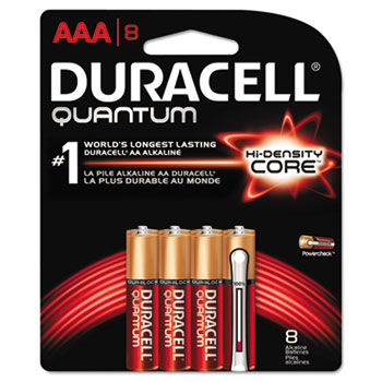 Stock up and save! Duracell Quantuma revolutionary advancement in battery technology. Its the only battery with Hi-Density Core Technology for unbeatable long-lasting power and Powercheck for instantly checking your power level at any time. Duralock Power Preserve Technology is guaranteed for 10 years in storage. Quantum batteries are ideal for use in many battery-powered devices, including portable electronics, wireless mice, testing equipment, remote controls, flashlights, calculators, clocks, radios, keyboards and more. Stock up and save! Battery Type: Alkaline; Battery Size: AAA; For Use With: Everyday Electronic Devices; Voltage: 1.5 V.
