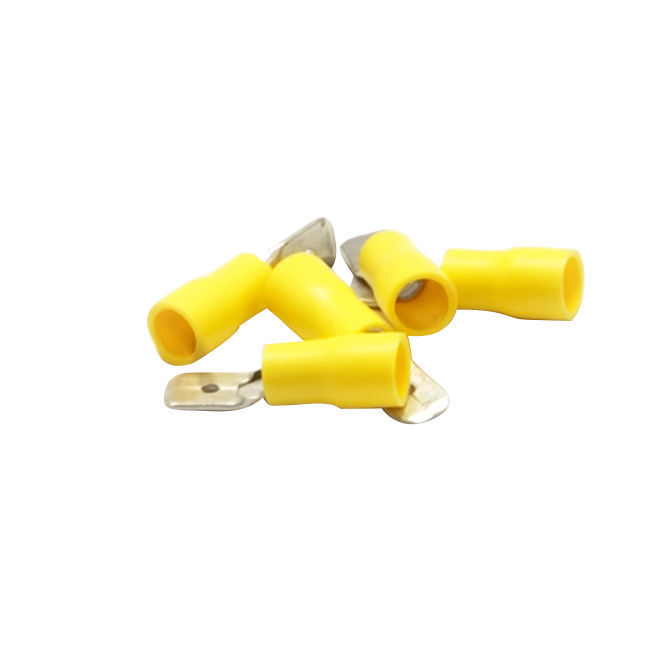 Yellow Male Disconnect, 16-14 AWG. These yellow male spades are designed for use with an equivalent female for wires of the following gauges(AWG): 10 and 12. They connect two wires while supplying a quick and simple disconnect option. One uses this quick disconnect terminal by inserting the bare wire end into the terminals flared end and then crimping. Additional Details Wire: 12 to 1 AWG.Weight: .23 lbs.Color: Yellow..Male Disconnect. BRAND : CABLE WHOLESALE