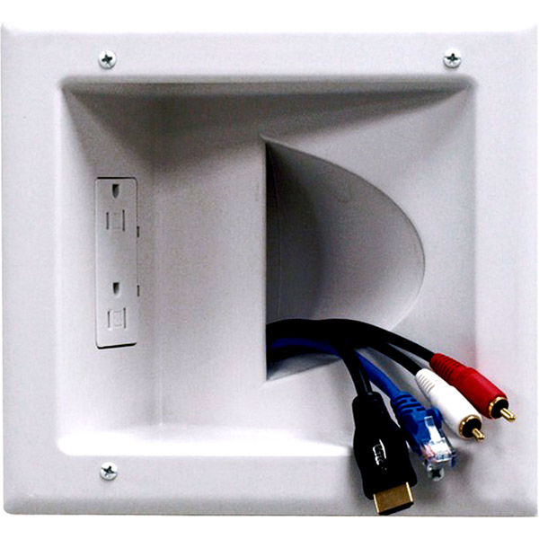 RECESSED LOW VOLTAGE MEDIAPLATEDUPLEX RECEPTACLE Low profile design fits behind the industry's thinnest mounts and TVs Conceal multiple AV cables behind your flat panel TV15 amp and 125 volt tamper resistant with duplex receptacleUL Listed componentMounting wings are molded into the media plate and fasten tightly against the back of the drywallQuick and easy to install with no additional parts needed BRAND : DATACOMM