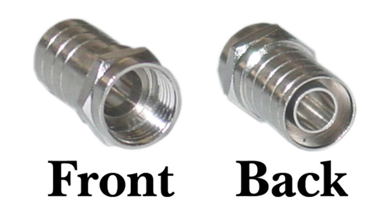 RG6 F-pin Coaxial Crimp On Connector with Long Barrel. This is a long barrel crimp-on connection that will attach to an RG6 cable and create a TV-style F-Pin connection. The long barrel design allows for a more secure connection. Additional Details Connection: F-pin Male Plug. Weight: .1 lbs. Product Type: Cable TV Accessories. The long barrel design allows for a more secure connection. BRAND : CABLE WHOLESALE