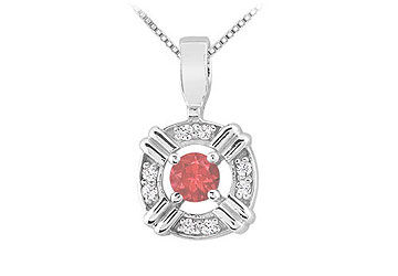 A bigger round ruby is prong-set in the center. Smaller brilliant-cut diamonds are set in the broad perimeter of the circle. Made in 14K white gold this pendant has a total gem weight (TGW) of 0.25 ct.