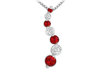 This delicate curve nicely holds graduating four rich red rubies three sparkling white diamonds in an alternative pattern. This pretty stylish journey pendant is made in 14K white gold and has a total weight (TGW) of 1.00 ct.