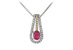 A prong-set, oval ruby is suspended from a yellow diamond bar in an elongated drop shape. White diamonds are set on drop. This pendant is made in 14K white & yellow gold and has a TGW of 0.75 ct.