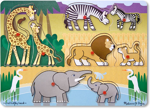 Melissa & Doug Safari Peg Puzzle Your child will "go wild" matching the baby animals to their parents in this sturdy wooden puzzle. Easy-grasp pegs and pictures under the pieces will help your child solve this simple 8-piece puzzle. Good for memory, fine motor and hand-eye skills practice." Case Pack 2 Age Rating: 2 yrs + Please note: If there is a color/size/type option, the option closest to the image will be shipped (Or you may receive a random color/size/type). Additional Details Age Rating: 2 yrs + BRAND : MELISSA & DOUG PRODUCT_CODE : 000772018739 PRODUCT_CODE_TYPE : UPC