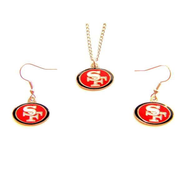 San Francisco 49ers Necklace & Dangle Earring Simple and bold, this NFL San Francisco 49ers Necklace and Earring Set is a must-have accessory to complete your game day wardrobe! The nickel-finish charm and earrings are decorated with your NFL team's logo. Necklace comes with 18-inch chain. These are metal and wire earrings for pierced ears, nickel-finish, and hypoallergenic. Logo approximately 3/4" EACH in diameter. Fish hook earring hanger. Imported. Officially licensed NFL product." Sold Individually Please note: If there is a color/size/type option, the option closest to the image will be shipped (Or you may receive a random color/size/type). BRAND : AMINCO PRODUCT_CODE : 763264190107 PRODUCT_CODE_TYPE : UPC