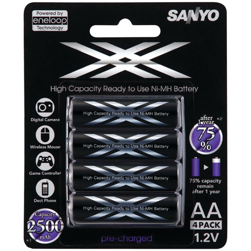 SANYO 4HR-3UWX eneloop 4 AA Rechargeable Batteries Rechargeable up to 500 times; Low self discharge-maintains 75% of their charge after 1 year of storage; Stable voltage with longer power life than Alkaline batteries; No memory effects; Recharges empty or partially drained batteries; Perfect for use in powering high drain devices Warranty ONE YEAR BRAND : SANYO