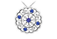Eight 14K white gold bars make a pretty flower. Each bar sparkle with round diamonds inside smaller circle and alternately diamonds & sapphires set in between the bar. Another square blue sapphire sits in the center. Made in 14K white gold this pendant has a total weight (TGW) of 1.00 carat.