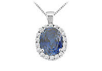 An oval intense azure sapphire takes the center stage with a TGW of 3.00 ct. beautifully bordered by brilliant-cut round diamonds. Accented on the top is a 14K white gold bar. This pendant has a total weight (TGW) of 3.50 carat.