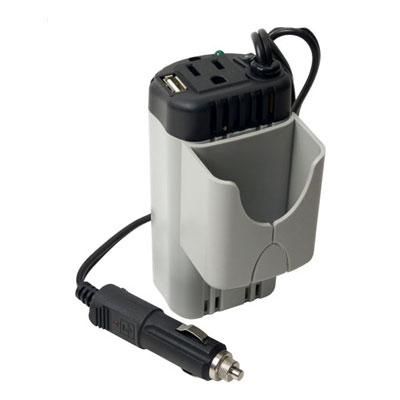 150 Watt continuous power, 450 Watt peak surge, Converts 12V DC to AC, Fits into most vehicle cup holders, Extra accessory holder for phones and MP3, Runs and charges 120V electronics in your vehicle, Plugs into any 12V cigarette lighter socket, Auto-reset short circuit protection, Built-in safety features, Low battery shutdown, Overload protection, Slim and portable. BRAND : WAGAN CORP.