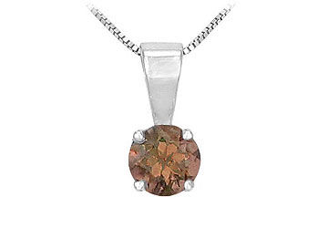 A round natural smoky topaz is securely held in a luscious 14K white gold prong setting. This gemstone pendant has a total weight (TGW) of 1.00 and comes with a standard 16 14K white gold chain. Available in yellow gold also.