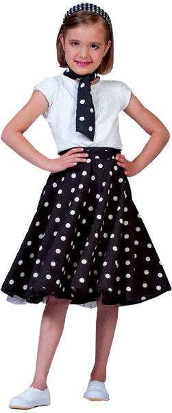 Sock Hop Skirt Child Black/White. Poly skirt with contrasting edge hem and scarf. Three-button adjustable waist 22.5 to 26 inches. Petticoat not included. See our petticoat selection. Child sized. Sold Individually FF740848 Please note: If there is a color/size/type option, the option closest to the image will be shipped (Or you may receive a random color/size/type). BRAND : WMU PRODUCT_CODE : 784717408488 PRODUCT_CODE_TYPE : UPC