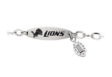 Polished stainless steel 7.5 inch Detroit Lions Team Name and Logo dangle oval ID bracelet.