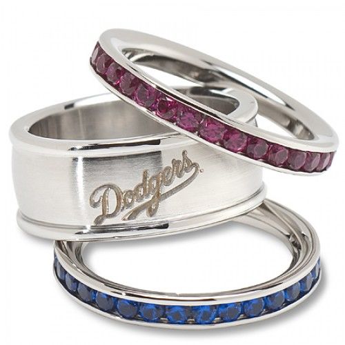 with This Los Angeles Dodgrs Team Logo Stacked Ring Set You DonT Have to Sacrifice Style to Support Your Favorite Mlb Team. This Los Angeles Dodgers Stacked Ring Set Features the Official Dodgers Logo and a Red Cubic Zirconia Gemstone. It Is Made Out of Stainless Steel and Is Officially Licensed By the Mlb. This Los Angeles Dodgers Stacked Ring Set Features Style and Quality Rolled Into One Cute Accessory. Processing Time: 10 days. BRAND : MLB OFFICIALLY LICENSED GEM TYPE : CUBIC ZIRCONIA GEM TYPE - 2 : CUBIC ZIRCONIA METAL STAMP : 11.4 METAL TYPE : STAINLESS STEEL METAL UNIT OF MEASURE : GRAMS SIZE : 6,7,8 STONE CLARITY : I1 STONE CLARITY - 2 : I1 STONE COLOR : RED STONE COLOR - 2 : BLUE STONE COLOR - 3 : RED STONE CUT : VERY GOOD CUT STONE CUT - 2 : VERY GOOD CUT STONE SHAPE : ROUND SHAPE STONE SHAPE - 2 : ROUND SHAPE STONE WEIGHT : 1.00 STONE WEIGHT - 2 : 1.00 TOTAL GEM WEIGHT : 2.00 TOTAL METAL WEIGHT : NO METAL STAMP UNIT OF MEASURE (DIMENSIONS) : MM