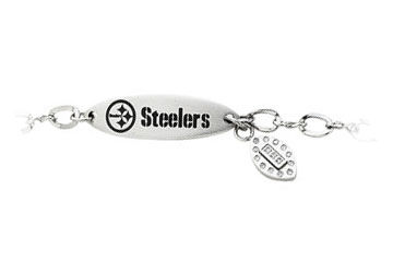 Polished stainless steel 7.5 inch Pittsburgh Steelers Team Name and Logo dangle oval ID bracelet.