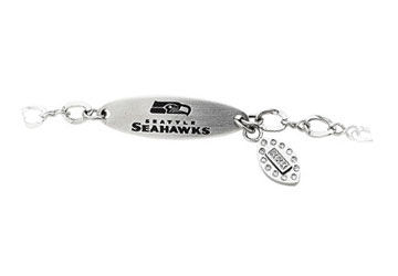 Polished stainless steel 7.5 inch Seattle Seahawks Team Name and Logo dangle oval ID bracelet.