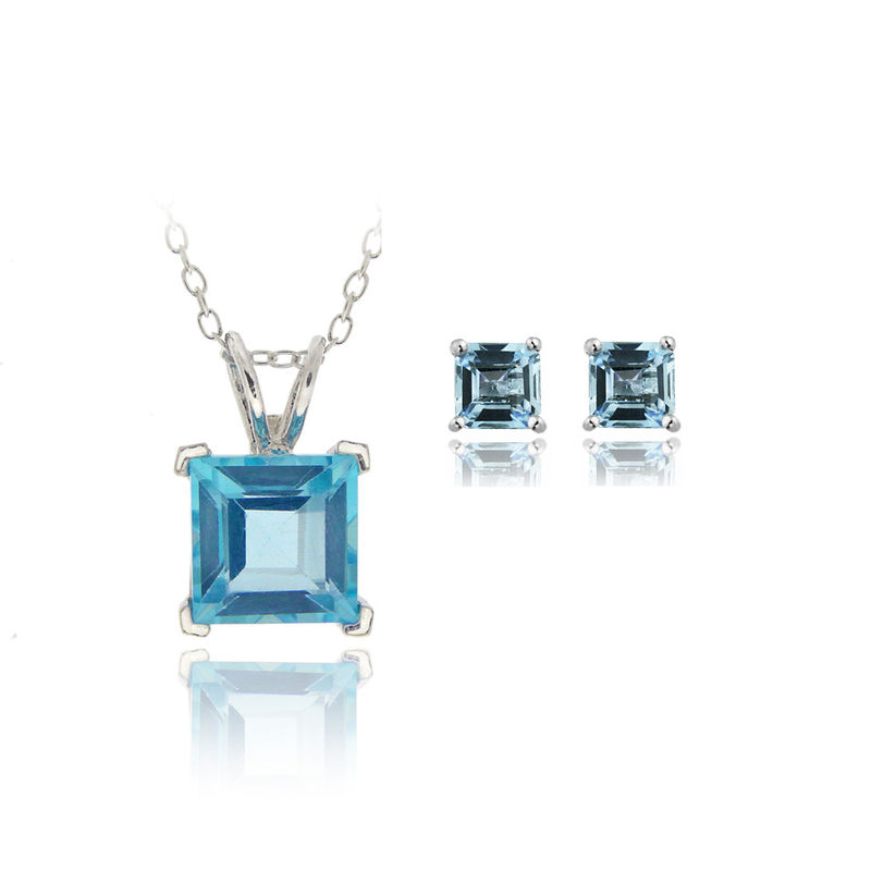 Product Description This classic jewelry set features a square princess cut solitaire pendant and matching square stud earrings. The pendant showcases a sparkling 7mm swiss blue topaz stone and the earrings feature two 5mm swiss blue topaz stones. The jewelry is crafted of solid sterling silver with high-quality rhodium plating for maximum shine and tarnish protection. Pendant dangles from an 18 chain. Total gem weight: 3.65ct. Product Details Metal Type: sterling-silver Metal Stamp: 925-sterling Width: 8 mm Height: 12 mm Clasp Type: spring-ring Backfinding: post-with-friction-back Stone Details: swiss-blue-topaz Stone Weight: 2.15 Shape: square-shape Setting: prongs swiss-blue-topaz Stone Weight: 1.5 Shape: square-shape Setting: prongs