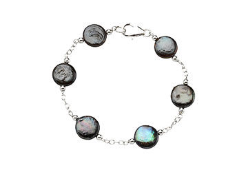 Six freshwater black coin 12-13 MM cultured pearl station 7.5 inch bracelet are beautifully linked in a delicate silver chain. Made in polished .925 sterling silver.