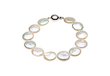 Sterling Silver and Freshwater White Cultured Coin Pearl Bracelet - 8 Inch/13-14 MM |
