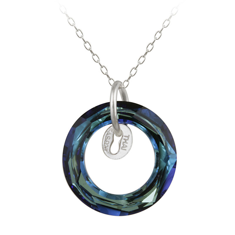 Take a modern twist on the classic circle design with this unique necklace. Crafted of fine sterling silver this necklace features a circle bermuda blue Swarovski elements pendant. Wear this trendy and fun pendant anytime and anywhere. Buffed to a brilliant luster the pendant rests on an 18-inch rolo chain and secures with a spring ring clasp.>