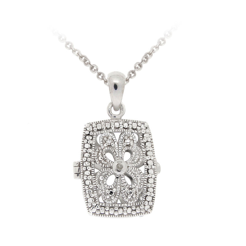 Product Description Enhance you jewelry collection with this lovely rectangle locket necklace. The pendant showcases a filigree flower design and decorated with silver pave detailing simulating shimmering stones. One genuine diamond is set in the center of the locket. The pendant dangles from an 18-inch rolo chain and is secured by a spring ring clasp. The pendant and chain are crafted of sterling silver. Total diamond weight: .01ct. Product Details Metal Type: sterling-silver Metal Stamp: 925-sterling Width: 14.25 mm Height: 27 mm Clasp Type: spring-ring Stone Details: diamond Stone Weight: 0.01 Shape: round-shape Color: I-J Clarity: I2-I3 Setting: pave
