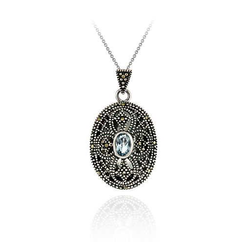 Sterling Silver Filigree Marcasite & Genuine Blue Topaz Cross Locket |