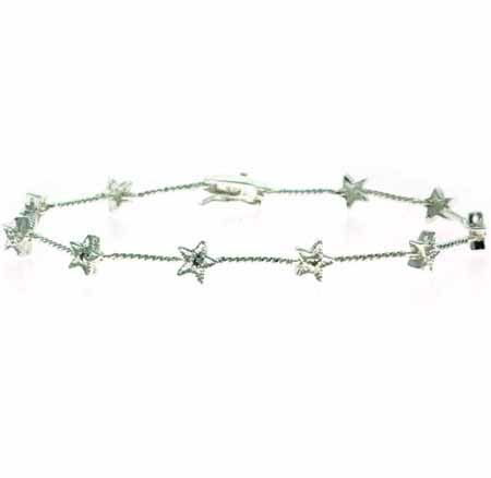 Product Description Sparkling Stars Three Genuine Diamond Accents sparkle in this endearing Star Tennis Bracelet. Product Details Metal Type: sterling-silver Metal Stamp: 925-sterling Width: 6 mm Clasp Type: box-with-tongue-and-safety Stone Details: diamond Stone Weight: 0.01 Shape: round-shape Color: I-J Clarity: I2-I3 Setting: pave