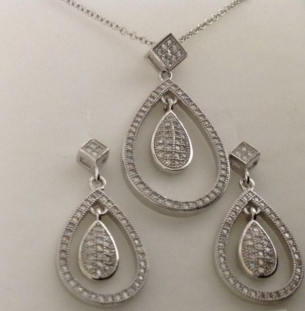Sterling Silver 925 Necklace and Earring Set Lead-Free and Nickel-Free. 18" Chain with a Pendant and matching Earrings. Micropave Cubic Zirconia containing a total of 197 CZ's of the finest quality in a Gift Box.