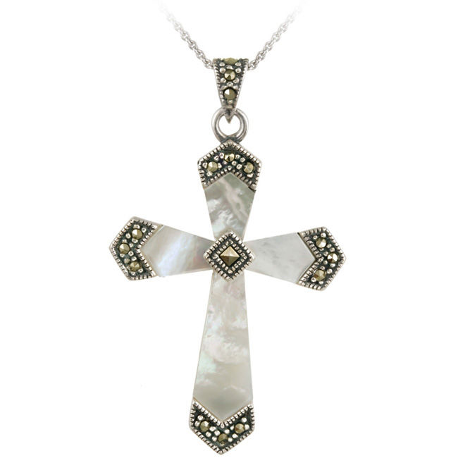 Wear and show the definition of religion with this beautiful cross pendant. The pendant showcases a mother of pearl cross etched with marcasite stones and polished sterling silver. The marcasite studded bale dangles from an 18-inch rolo chain. Pendant and chain are crafted of sterling silver. Product Details Metal Type: sterling-silver Metal Stamp: 925-sterling Width: 28.8 mm Height: 47.95 mm Clasp Type: spring-ring Chain Type: rolo Chain Length: 18 Stone Details: marcasite Stone Weight: 0 Shape: round-shape Setting: pave marcasite Stone Weight: 0 Shape: square-shape Setting: pave