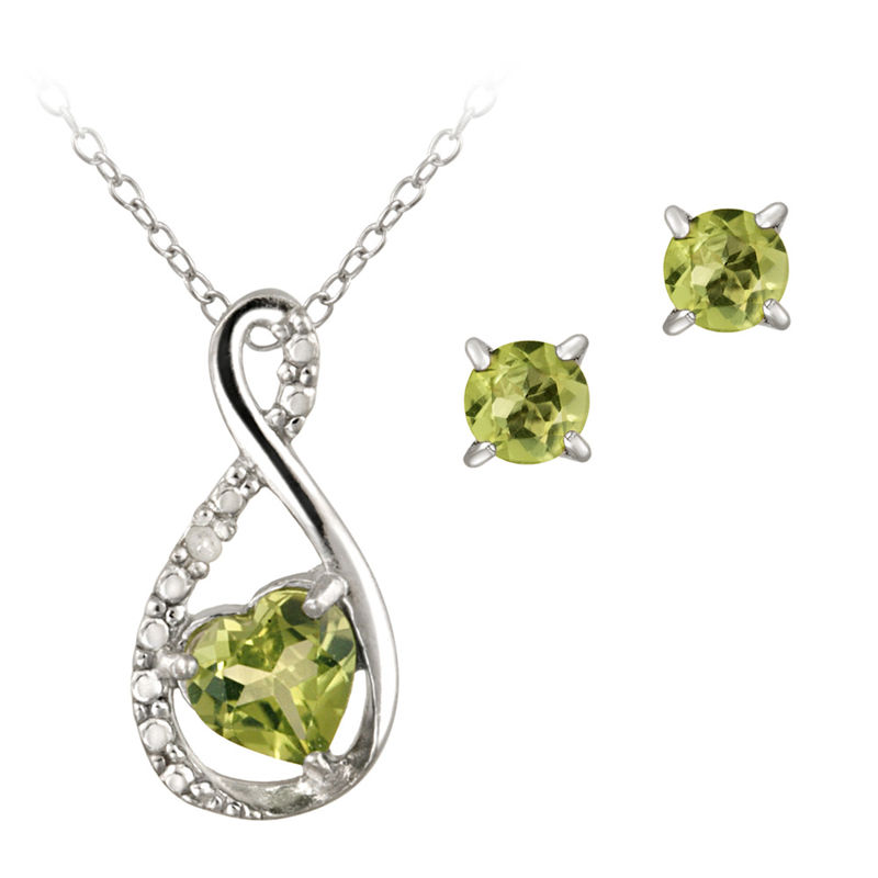 Product Description This jewelry set showcases a peridot swirl necklace with a pair of matching stud earrings. The pendant features a shiny swirl design with silver dotted detailing on the side which simulates white stones. A peridot heart shaped stone is set towards the bottom of the pendant and one genuine diamond is nestled within the dots. The stud earrings feature 4mm prong set round peridot stones. The pendant dangles from an 18-inch rolo chain and the earrings are secured by post and friction backs. The entire set is crafted of sterling silver. Total gem weight: 1.3ct total diamond weight: .01ct. Product Details Metal Type: sterling-silver Metal Stamp: 925-sterling Width: 17.8 mm Height: 9 mm Clasp Type: spring-ring Backfinding: post-with-friction-back Stone Details: peridot Stone Weight: 0.74 Shape: heart-shape Setting: prongs peridot Stone Weight: 0.56 Shape: round-shape Setting: prongs diamond Stone Weight: 0.01 Shape: round-shape Color: I-J Clarity: I2-I3 Setting: pave