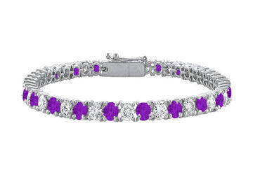This never ending chain of alternating round purple amethysts and white CZs symbolizes your timeless love. Crafted in .925 sterling silver rhodium held in a prong setting this tennis bracelet has a total gem weight (TGW) of 10.00 carats. A great way to honor your union.