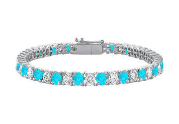 This delicate tennis bracelet surrounded on your wrist alternate with round blue topaz and white CZs in prong setting. The entire bracelet is crafted from .925 sterling silver rhodium has a total gem weight (TGW) of 10.00 carats is secured with a safety clasp.