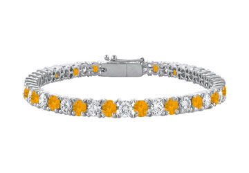 This delighted tennis bracelet surrounded on your wrist alternate with round citrines and white CZs in prong setting. The entire bracelet is crafted from .925 sterling silver rhodium has a total gem weight (TGW) of 7.00 carats is secured with a safety clasp.