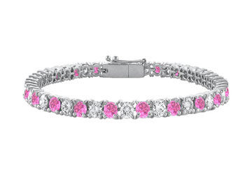 Vividly hued round created pink sapphires alternate with white CZs to make this delicate and feminine bracelet. Made in .925 sterling silver rhodium prong-setting this has a total gem weight (TGW) of 10.00 carats. This tennis bracelet makes a great way to express your eternal love.