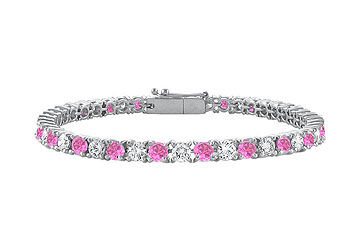 Vividly hued round created pink sapphires alternate with white CZs to make this delicate and feminine bracelet. Made in .925 sterling silver rhodium prong-setting this has a total gem weight (TGW) of 3.00 carats. This tennis bracelet makes a great way to express your eternal love.