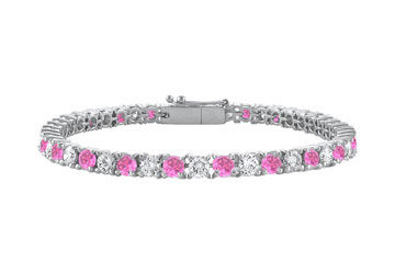 Vividly hued round created pink sapphires alternate with white CZs to make this delicate and feminine bracelet. Made in .925 sterling silver rhodium prong-setting this has a total gem weight (TGW) of 5.00 carats. This tennis bracelet makes a great way to express your eternal love.