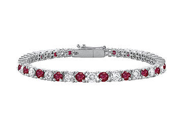 Get caught in the rapture of GF bangkok rubies and white CZs. Radiant round created rubies alternate with white CZs in a .925 sterling silver rhodium prong-setting. With gems consistent all around it symbolizes your eternal love. This tennis bracelet has a total gem weight (TGW) of 4.00 carats.