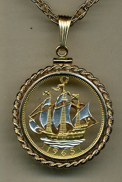 Real British ½ penny coin cut outs in new un-circulated condition. A little bigger than a U.S. quarter. First a small hole is drilled in the coin, then a very fine jewelers saw blade is inserted through the hole and worked around the coins design, (by hand) cutting away the background. Thus leaving the coins figure floating inside its outer edge (rim). The figure is then selectively layered (by hand) in Brilliant Gold & Silver. Each work of art comes complete, on 14K gold layered 18 rope chain. All are mounted in a beautiful Gold Filled rope type bezel and in a nice jewelry box. Warranty 90 days BRAND : J&J Coin Jewelry