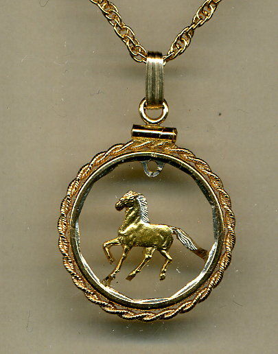 Real Uruguay 10 centesimo coin cut outs in new un-circulated condition. U.S. penny size. First a small hole is drilled in the coin, then a very fine jewelers saw blade is inserted through the hole and worked around the coins design, (by hand) cutting away the background. Thus leaving the coins figure floating inside its outer edge (rim). The figure is then selectively layered (by hand) in Brilliant Gold & Silver. Each work of art comes complete, on 14K gold layered 18 rope chain. All are mounted in a beautiful Gold Filled rope type bezel and in a nice jewelry box. Warranty 90 days BRAND : J&J Coin Jewelry