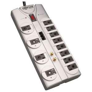 Tripp Lite's TLP1208TELTV offers economical AC surge suppression for protection of workstations, PCs, telecom systems, home electronics and other sensitive equipment. The TLP1208TLTV features 12 outlets, an 8-ft. cord with a space-saving right-angle plug, and diagnostic LEDs to warn of suppressor damage. The unit has a surge suppression rating of 2880 joules to shield equipment from line noise and the strongest surges. Built-in RJ11 jacks prevent surges from damaging your modem/fax/phone equipment. Built-in digital 2.2GHz coax jacks prevent surges from damaging your cable/satellite equipment. $150,000 Ultimate Lifetime Insurance (USA & Canada only).