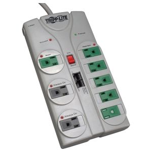 Surge protector offers energy-saving advanced surge protection for all audio/visual components with master outlet, five Eco-Surge and two surge-only outlets. Eco outlet allows one device to control power to peripherals by cutting AC power when not in use. Always-on/surge only outlets provide continuous power. Auto/manual switch allows you to switch between power-save mode and standard (manual) surge protection. Two diagnostic LEDs alert you to protection and grounded status, and four status LEDs indicate when AC power is present. Eco-Surge protector also has a unique Netbook switch that allows you to select wattage. Network-grade AC suppression rated at 2160 joules shields equipment from surges and line noise. Keyhole slots provide convenient wall or cabinet mounting. Surge protector features one-line telephone/network protection; digital coax surge jacks; integrated child-safety outlet covers, and an 8' cord with space-saving angle plug.