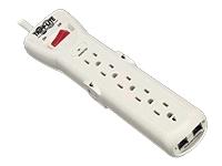 Tripp Lite's SUPER6TEL12 surge suppressor offers complete AC and phone line surge suppression for comprehensive protection of workstations, desktop PCs, telecom systems and other sensitive electronics. High-grade AC surge suppression shields connected equipment from damage and performance problems due to transient surges. Set of RJ11 telephone line suppression jacks protect dialup and DSL modem lines, fax machines, cordless phones and more. SUPER6TEL12 offers 7 total outlets, 12 foot cord and diagnostic LEDs to warn of wiring problems and suppressor damage. Heavy grade AC suppression rated at 1080 joules shields equipment from surges and line noise. Attractive white suppressor housing with keyhole mounting tabs and 3 designated transformer plug outlets offers convenient protection of desktop computer equipment and accessories. Lifetime warranty with $50,000 Ultimate Lifetime Insurance (USA & Canada Only).
