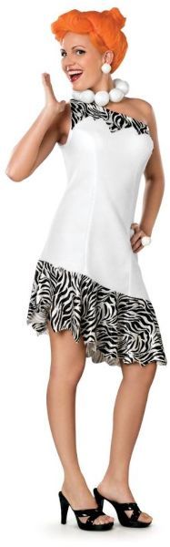 One shoulder white and black print dress, orange wig and "pearl" necklace. Teen Extra Small fits girl's size 4-6. Polyester." Sold Individually